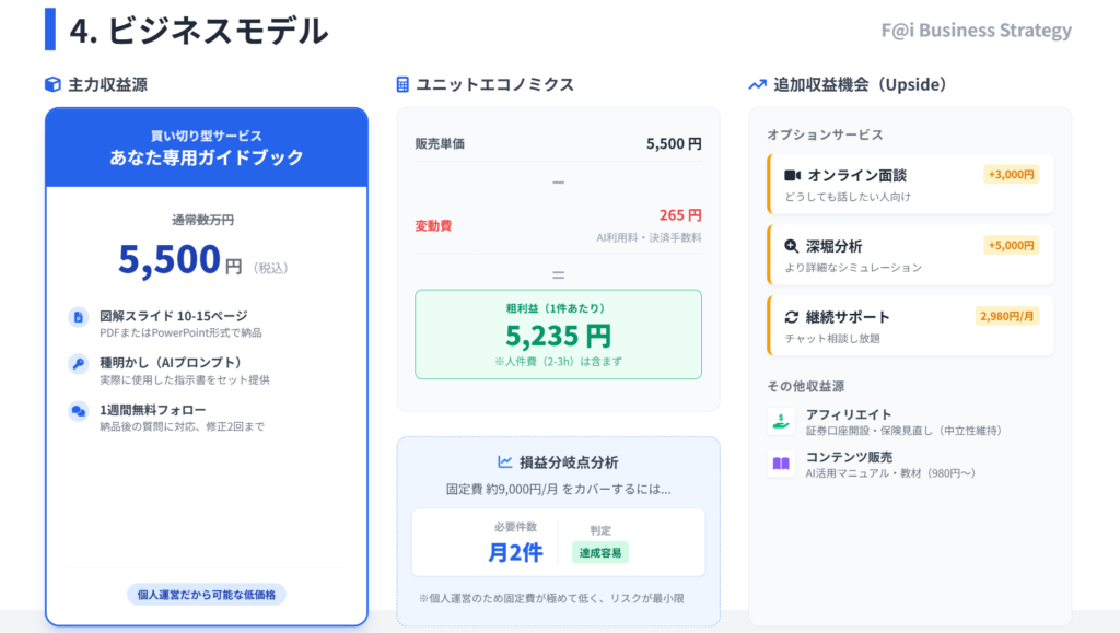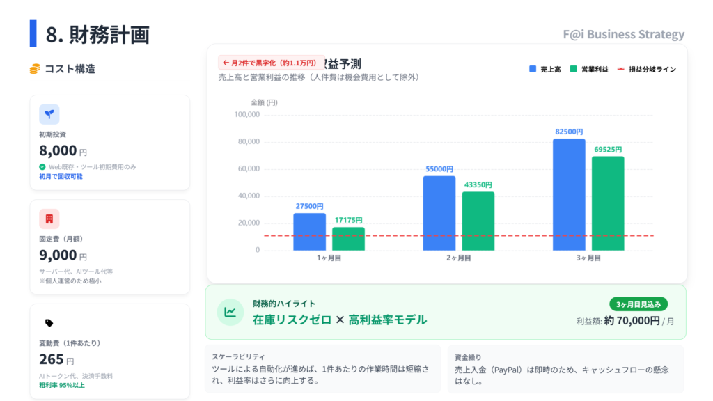 「財務計画」に示される通り、3ヶ月目で約7万円の利益想定。在庫リスクゼロ×高粗利率モデルの威力です。