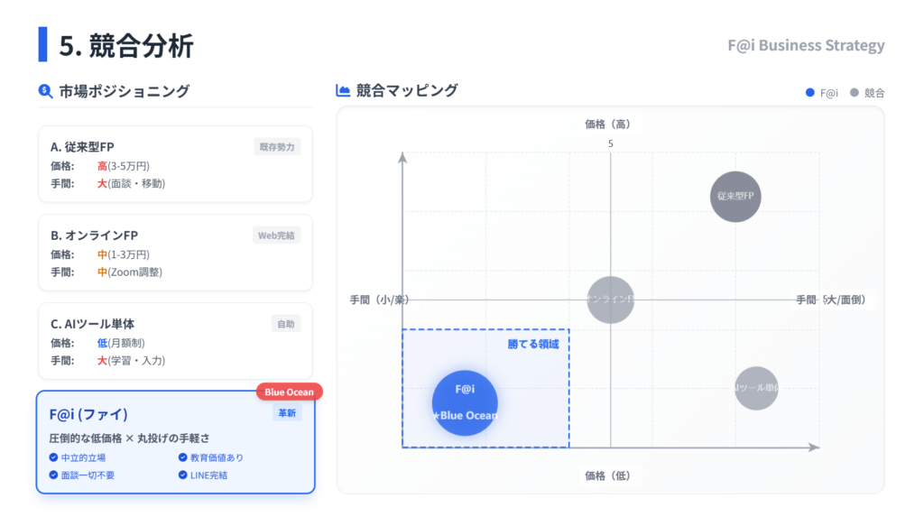 競合分析は「競合ポジショニングマップ」の通りです。F@iが狙う「低価格×低手間」のポジションは、直接競合が存在しない(あるいは少ない)まさにブルーオーシャンとなります。