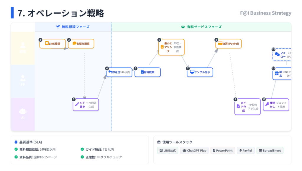 「オペレーションフロー」に示される通り、「誰が、いつ、何をするか」が明確になっていることが重要です。F@iでは無料相談から有料サービスまでの流れを可視化し、品質基準(SLA)も設定しています。