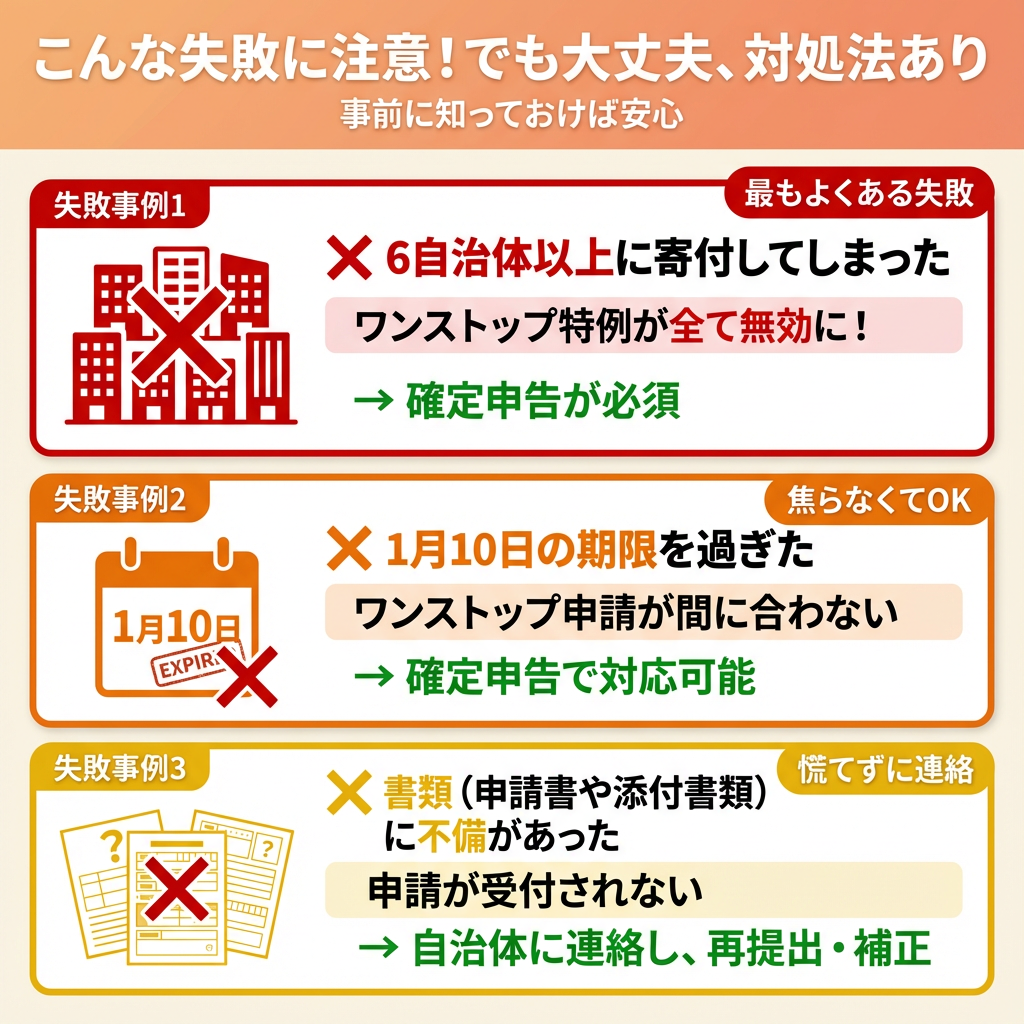 → 最もよくある失敗です! この場合、ワンストップ特例はすべて無効になります。必ず確定申告で全ての寄付を申告してください。「5自治体まではワンストップ、6自治体目以降は確定申告」という分け方はできません。