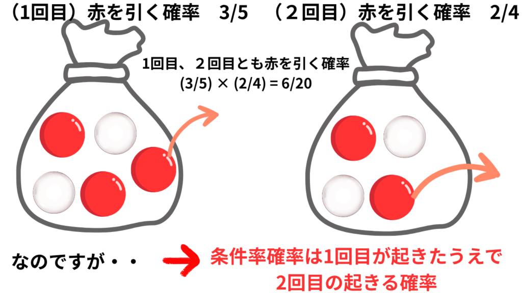 分子 = 1回目赤かつ2回目赤 = (3/5) × (2/4) = 6/20