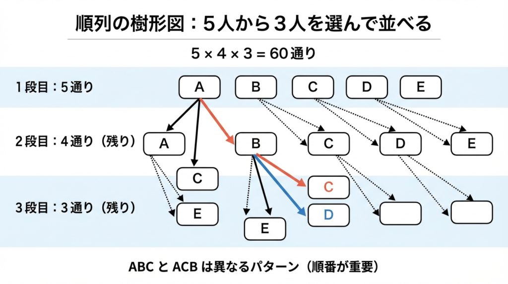 5! ÷ (5−3)! = (5×4×3×2×1) ÷ (2×1) = 5×4×3 =60通り