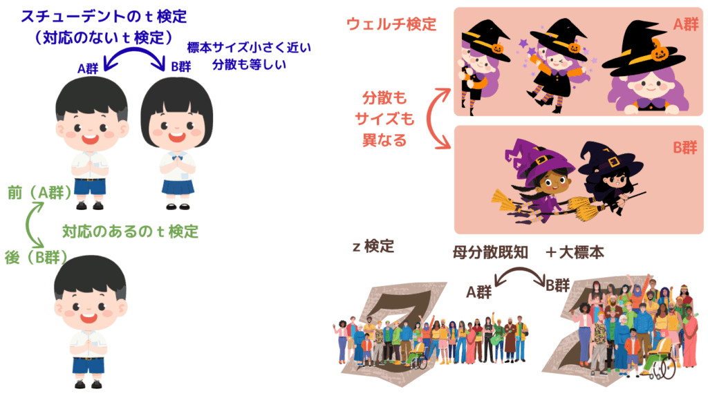 | z検定 (平均の差) | 別々の2群 (独立) | 母分散が既知 | 母分散が既知かつ標本サイズが大きい場合 | 母分散が既知+大標本が条件(実務では稀) |