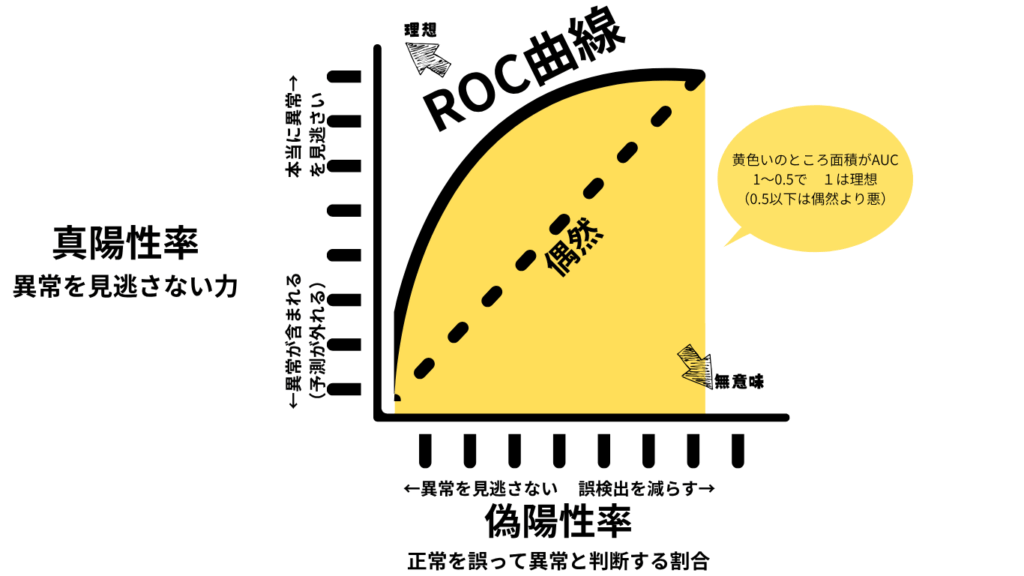 - 縦軸(TPR:真陽性率):異常を見逃さない