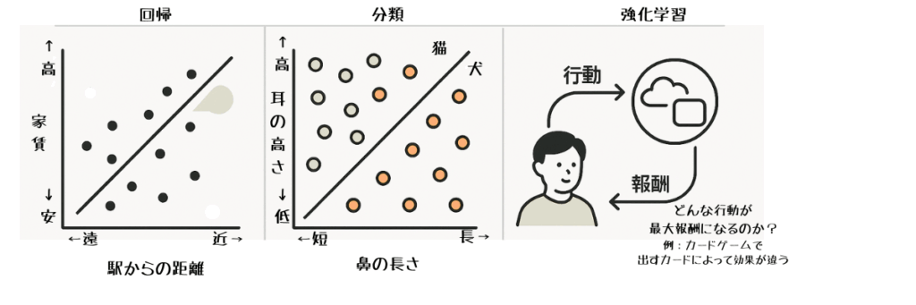 教師あり学習, 教師なし学習, 強化学習, 回帰, 分類,