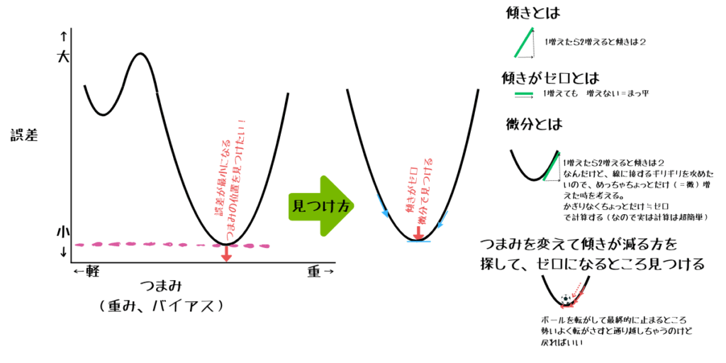 誤差を小さくするための調整は、実は高校数学で習う「微分」の考え方で行われています。